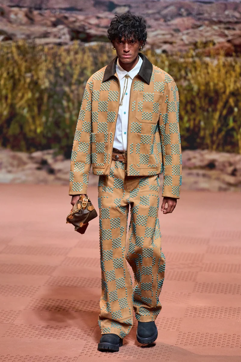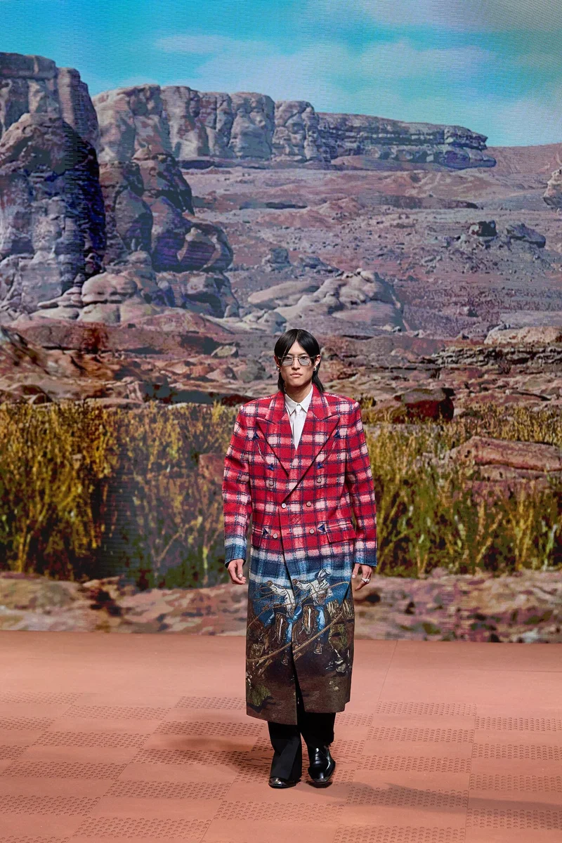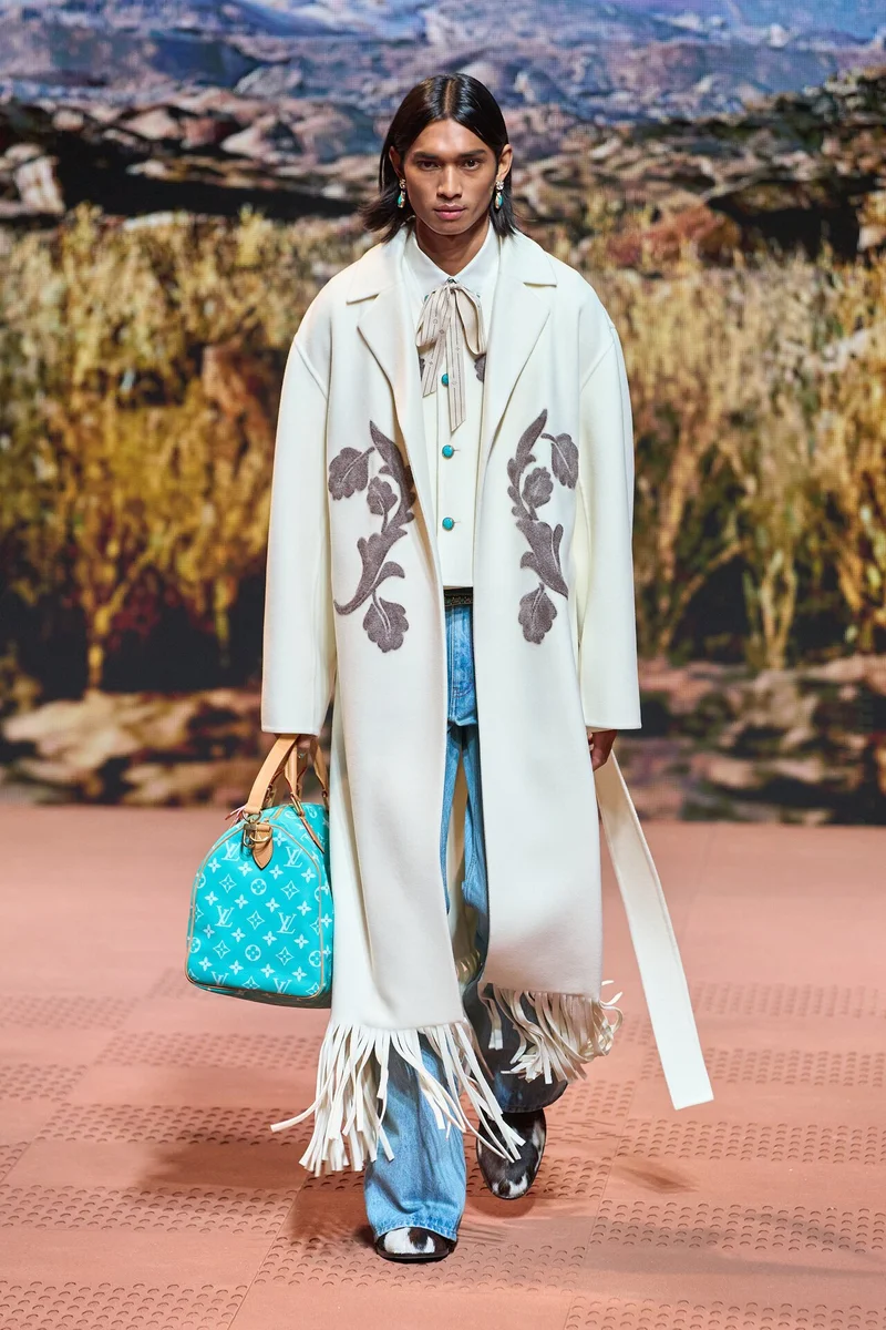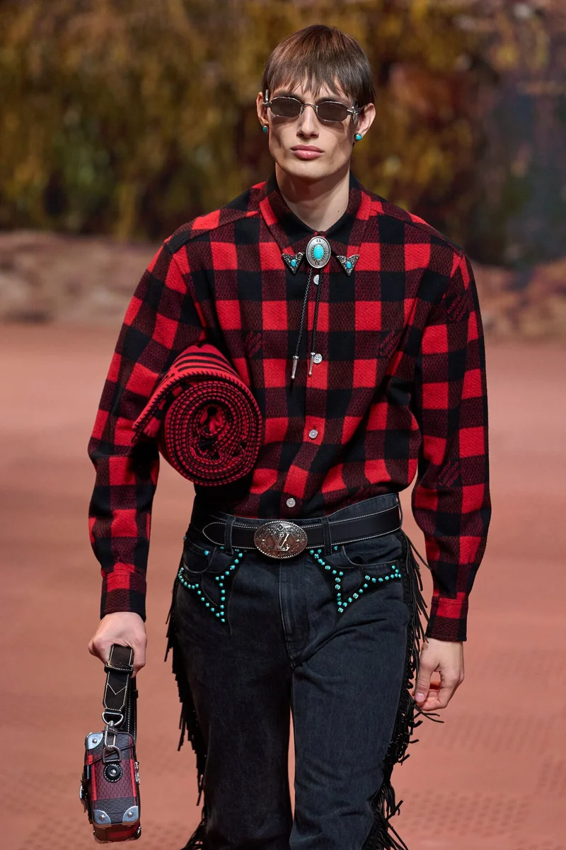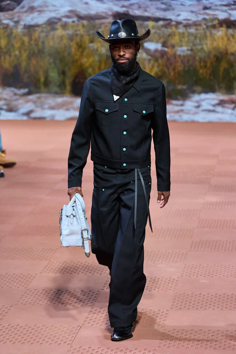 Третья коллекция Уильямса для знаменитого бренда посвящена Дикому Западу. На это уже намекали стильные приглашения на модное шоу - черные шляпы и губные гармошки. Локация была оформлена в этом же стиле. В организации пространства дизайнеру помогали художники из народов Дакоты и Лакоты. Подиум напоминал песчаные дороги, окруженные сухим кустарником и каньонами.