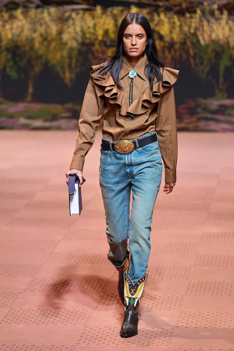 Сама коллекция, разумеется, включила в себя множество элементов жанра вестерн: ковбойские шляпы, брюки клеш, бахрома на рубашках и пальто, казаки и крупные пряжки ремней. Из материалов особенно выделяются замша, кожа и деним - вполне логично. Без меха, конечно, тоже не обошлось.