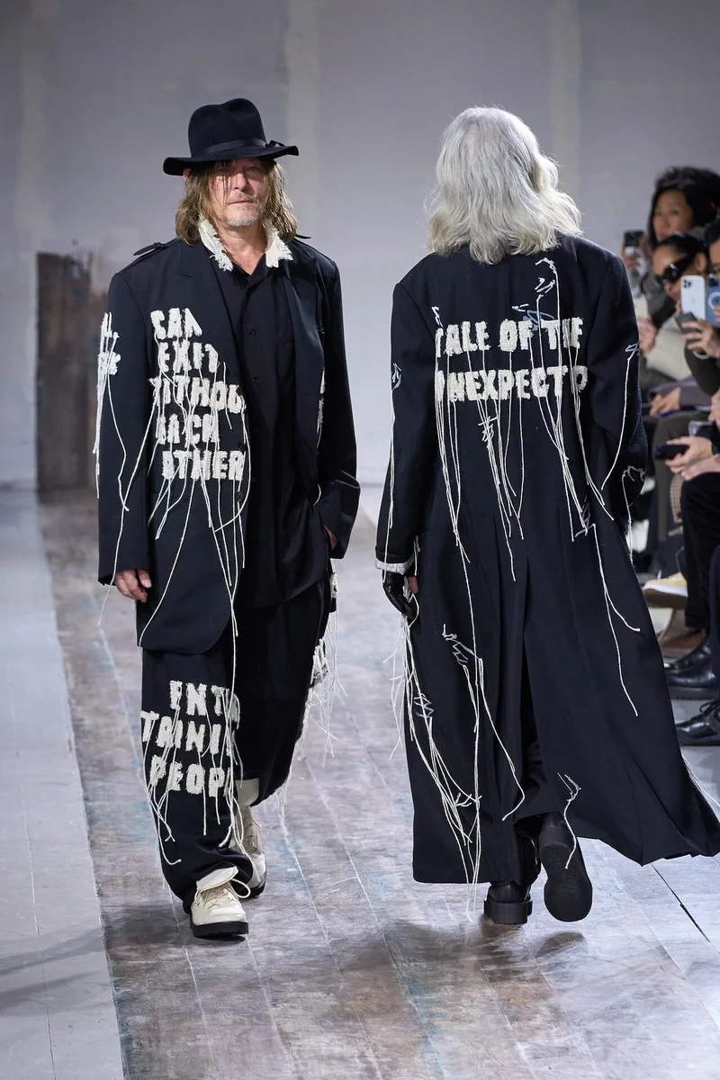 Для презентации новой коллекции дизайнер пригласил друзей своего бренда. Он хотел показать максимально разных людей - по возрасту, росту и даже профессии. Одним из самых неожиданных выходов стало появление на подиуме Нормана Ридуса - звезды сериала "Ходячие мертвецы". Также в шоу принял участие режиссер и продюсер Вим Вендерс.