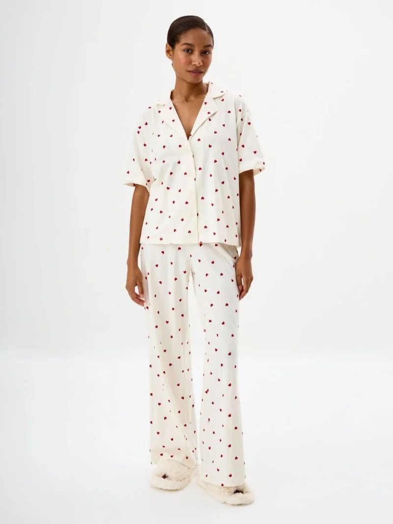 Еще один вариант пижамы с сердечками. На этот раз из трикотажа молочного оттенка, а рубашка с коротким рукавом. Смотрится очень симпатично и стильно.