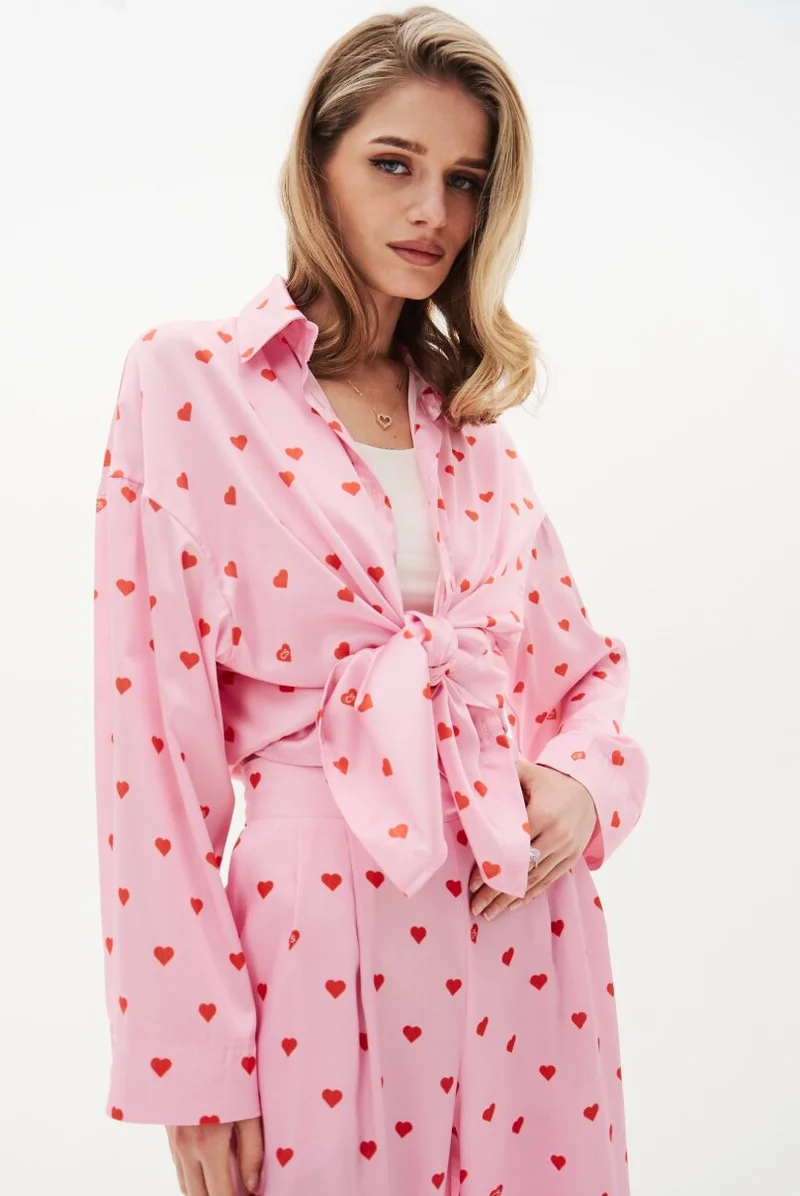 Розовая пижама с сердечками из легкого сатина - отличный выбор как для домашних романтических посиделок, так и для пижамной вечеринки. Рубашка с отложным воротником и брюки на резинке - удобно и мило.