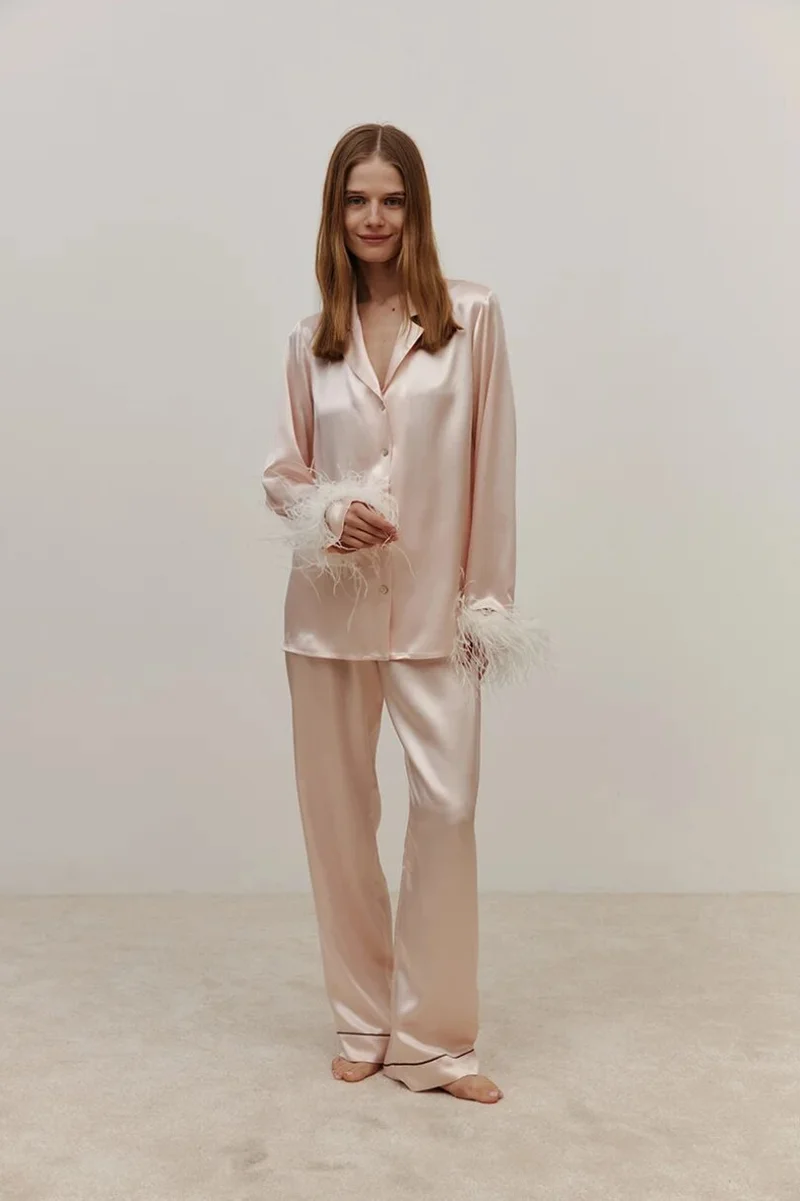 Тем, кто хочет добавить шика и праздника в домашние образы точно заглянуть на страничку бренда. Шелковая пижама в стиле old money с перьями на рукавах - роскошь в чистом виде.