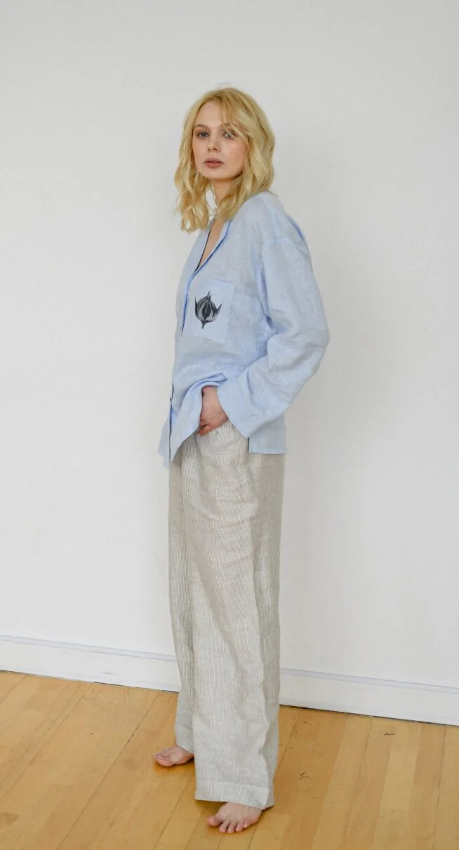 Льняная пижама с брюками в полоску от экологичного питерского бренда - это эстетика и комфорт в одном флаконе. Также у ребят можно найти потрясающие халаты с вышивкой, домашние костюмы в японском стиле и многое другое.