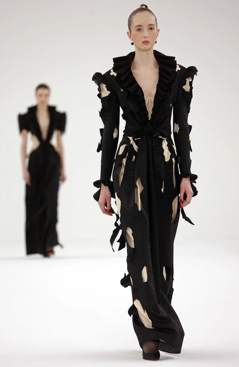 Фирменные А-силуэтные платья на этот раз обзавелись вырезами в неожиданных местах, в то время как остальные наряды хвастались дырками с "обожженными краями". Цвета коллекции выглядят более чем лаконично: оттенки черное и телесный.