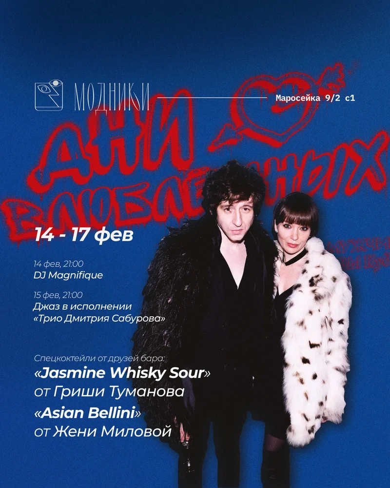 Не ограничиваются одним днем в "Модниках". Программа на Дни влюбленных насыщенная: 14 февраля - Dj Magnifique, 15 февраля - джаз от "Трио Дмитрия Сабурова", 16 и 17 февраля - вечеринки с Dj-сетами и free-бокалом игристого для девушек. Кстати, напитки - отдельная тема Дней влюбленных. В баре будут подавать два коктейля от друзей "Модников", соавтора telegram-канала "Мужчина, вы куда?" Гриши Туманова и его любимой, автора telegram-канала "Сторожевая Милова", Жени Миловой. От него - Jasmine Whisky Sour, крепкий с цветочными нотами, а от нее - Asian Bellini, нежный с пюре из свежего персика и добавлением персикового соджу.