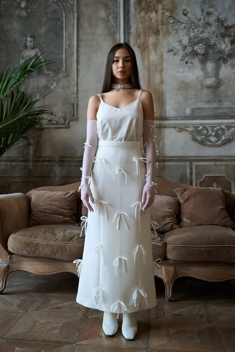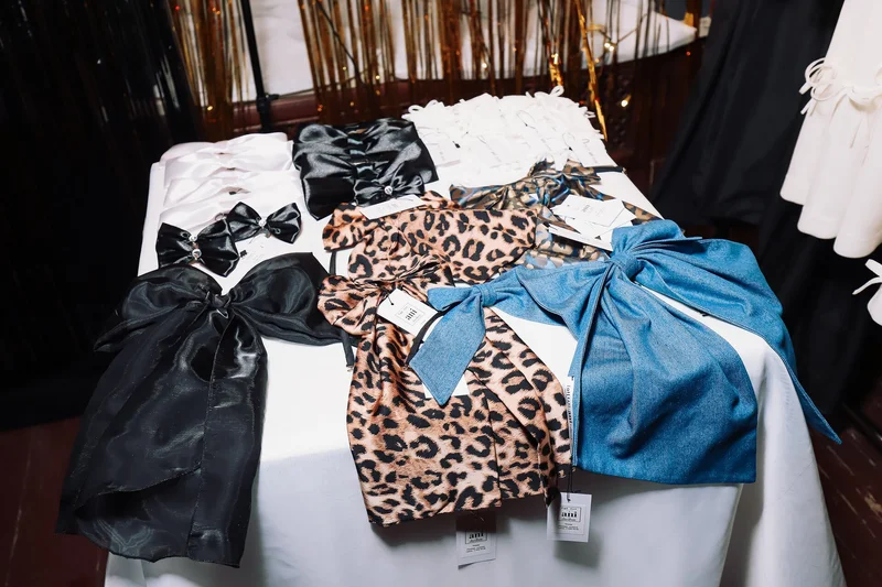 Коллекция Touch and trust X ANI лимитирована, все вещи отшивались вручную московскими мастерицами. Титульный айтем - юбка макси и высокие перчатки "Opera" в белом цвете, расшитые маленькими рукотворными бантиками. Привлекающий внимание аксессуар - объемный бант "Gigante" в виде пояса. Воплощение уникальности " боди с одним рукавом, высоким плечом и бантом "Elegante". Около базовая вещь - красная оверсайз футболка "Pomade" с широким бантом на груди.