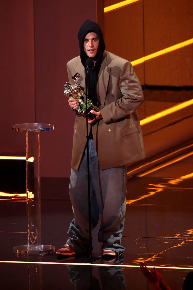 Джастин Бибер принимает награду "Артист года" во время церемонии MTV Video Music Awards, 2021 Источник фото: Bennett Raglin/Getty Images