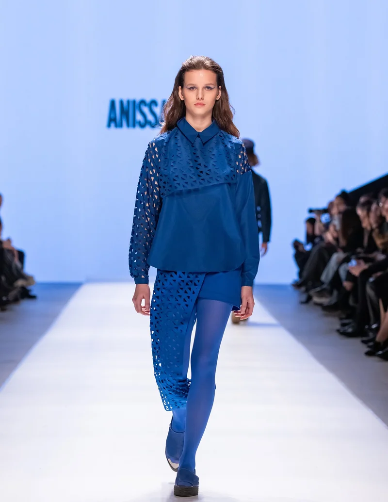 В основе концепции бренда Anissa Aida из Туниса лежит исследование сходства между силуэтами традиционной одежды на разных континентах, от Северной Африки до Дальнего Востока. Повторяющимся элементом коллекции стал узор, вдохновленный тунисской керамической плиткой, которую использовали в облицовке стен и полов начиная с XVI века. Цветовая гамма с обилием оттенков индиго отсылала к тем же архитектурным источникам вдохновения. Помимо женских выходов, в коллекции были представлены и мужские образы с лаконичными укороченными брюками, рубашками с воротником-стойкой и пальто без воротника. Многочисленные накладные карманы и дополнения в виде аккуратных шапочек присутствовали как в мужских, так и в женских комплектах.