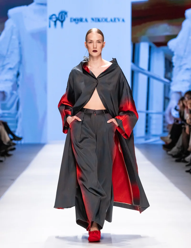 Коллекция якутского бренда Dora Nikolaeva сочетала глубокие черные оттенки и нежные бежевые, которые сменялись кроваво-алым, эффектами деграде и принтами тай-дай, напоминающими первобытные тотемные рисунки. Дефицит цвета в коллекции с лихвой компенсировался фактурами - буклированная шерсть, гладкая кожа, сетка, полупрозрачные ткани соединялись и наслаивались друг на друга, создавая сложные образы. Помимо повседневных моделей, можно отметить несколько авангардных дизайнерских решений: прозрачные брюки с декором из бахромы, асимметричное платье с одним рукавом и драпировкой, платье из телесной сетки и брючный комплект с градиентом от черного к алому.