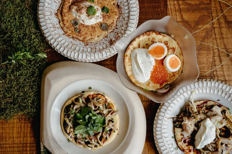 Если хочется экзотических вкусов и подач, смело отправляемся на Масленицу в Atlantica Seafood. Например, здесь предлагают черные блины с начинкой из мяса камчатского краба, икорным соусом и хрустящими слайсами дайкона, а также бездрожжевые оладьи из кабачка и шпината с ломтиками слабосоленого лосося и авокадо. А на десерт подают три вида блинных тортов: ягодный с клубникой, земляникой и малиной; со свежей голубикой и сиропом из топинамбура; карамельно-ореховый.
