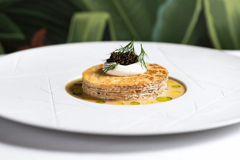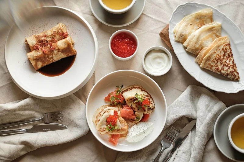 На роскошную Масленицу ждут в LILA Restaurant. Здесь блинчики сервируют в виде порционного блинного торта и подают с черной икрой, греческим йогуртом, свежей мятой и домашней сметаной. Аккомпанементом выступает соус шампань на основе сливок, лука шалот и шампанского.