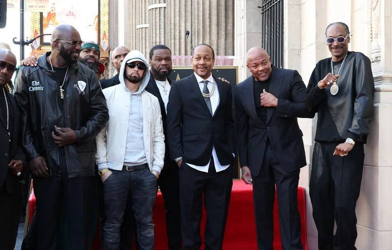 Big Boy, Эминем, 50 Cent, DJ Quik, Dr. Dre и Снуп Догг на церемонии открытия именной звезды Dr. Dre на Аллее славы, 2024 Источник фото: Monica Schipper/Getty Images