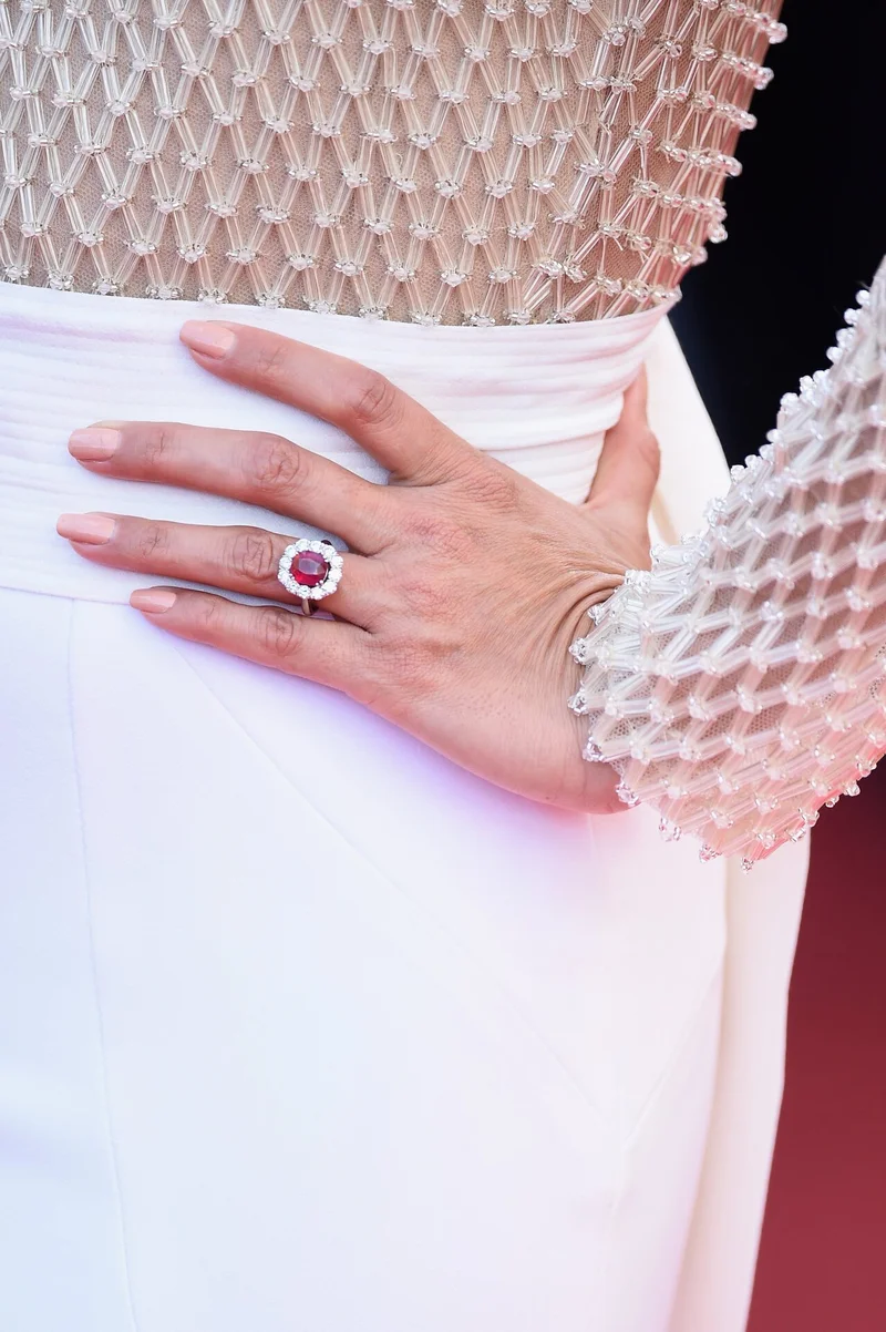 Красный рубин в окружении крупных бриллиантов действительно ослепляет. Для такой яркой и эффектной девушки подобное украшение в самый раз.