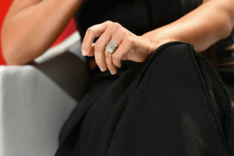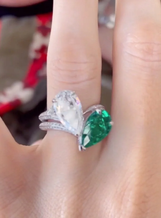 Джим Тот преподнес возлюбленной невероятно изящное кольцо. Крупный камень прямоугольной формы и бриллианты поменьше по всему украшению выглядят очень стильно и дорого.