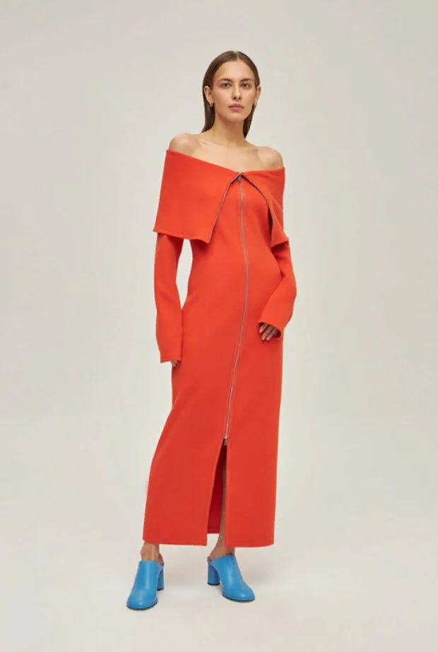Необычное оранжевое платье с молнией. Горловина-трансформер очень удобна в холодное время года.