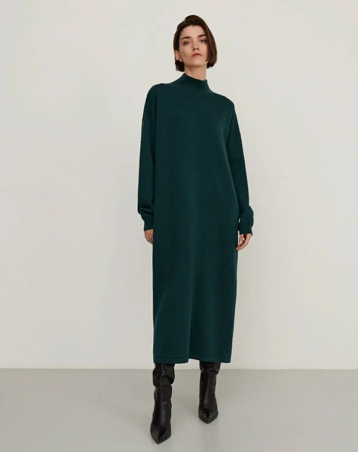 Темно-зеленое вязаное платье с шерстью даже выглядит тепло и уютно. Свободная модель для стильного образа.