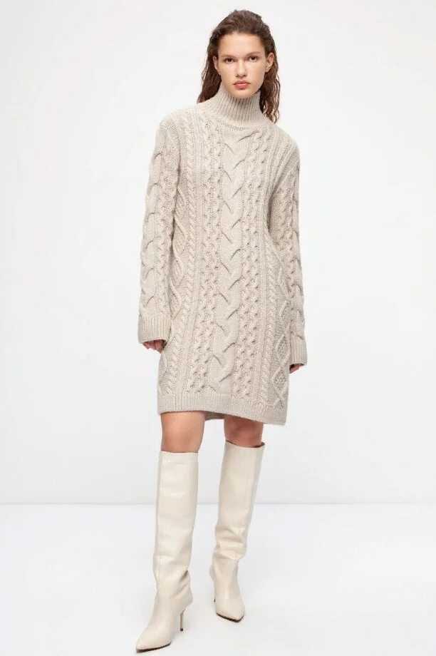 Бежевый наряд крупной вязки с арановым узором - самый уютный зимний образ.