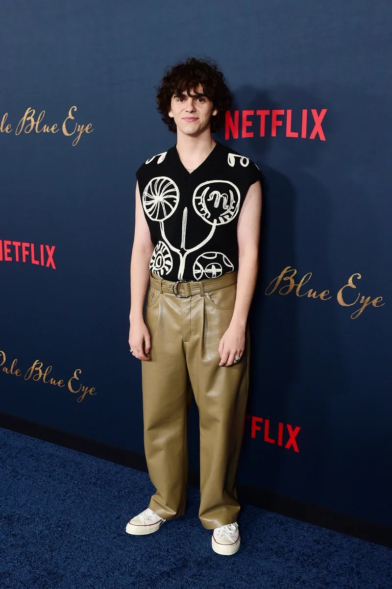 19-летний актер выглядит очень мило. Свободные кожаные брюки горчичного цвета и черная футболка с интересным принтом смотрятся стильно.