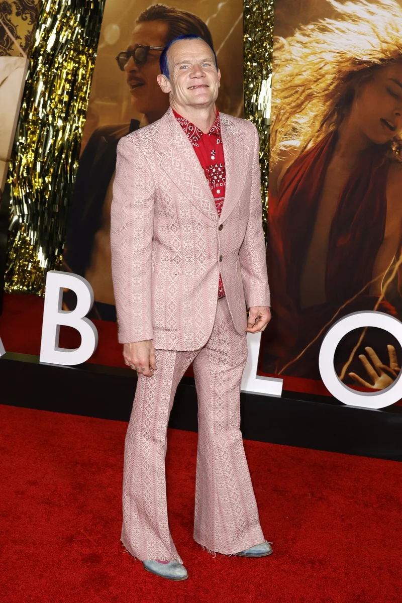 Басист знаменитой рок-группы Red Hot Chili Peppers тот еще бунтарь. Синие волосы, розовый костюм с орнаментом и голубые казаки впечатляют.