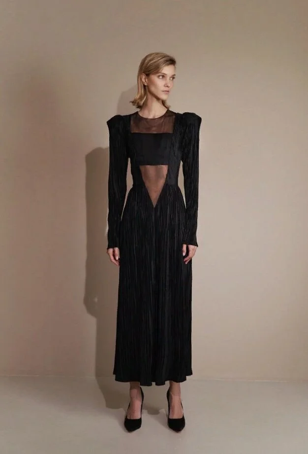 Черный строгий наряд с акцентированными плечами. Глубокий треугольный вырез привлекает к себе внимание и выглядит очень сексуально.