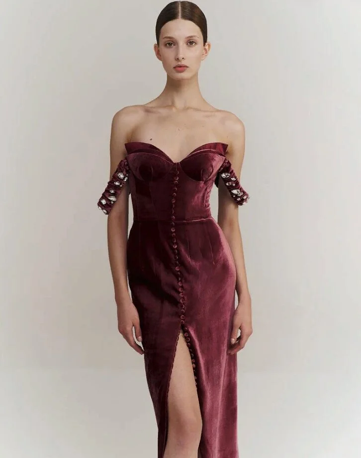 Элегантное бордовое платье из шелкового бархата. Декоративные элементы с кристаллами и множество пуговиц отлично дополняют изысканный наряд.