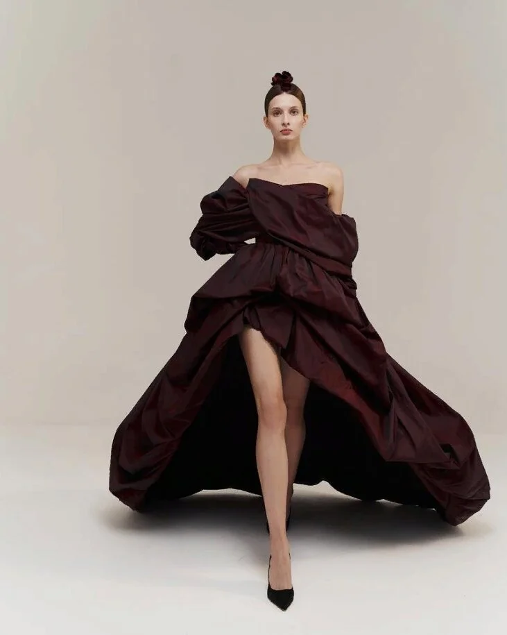 Королевское платье цвета Бургунди. Ассиметричная драпировка, длинный шлейф и открытые плечи для женственного и страстного образа.