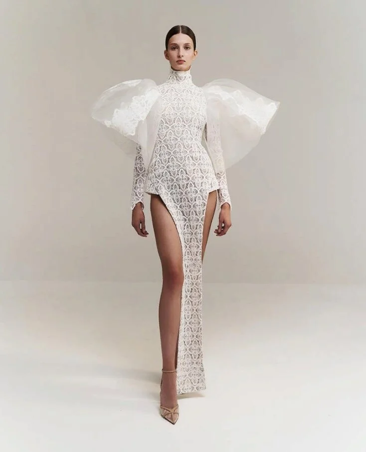 Невероятное платье с рукавами-буфами. Кружевной наряд с юбкой сложного кроя и воротником-стойкой смотрится смело и романтично.