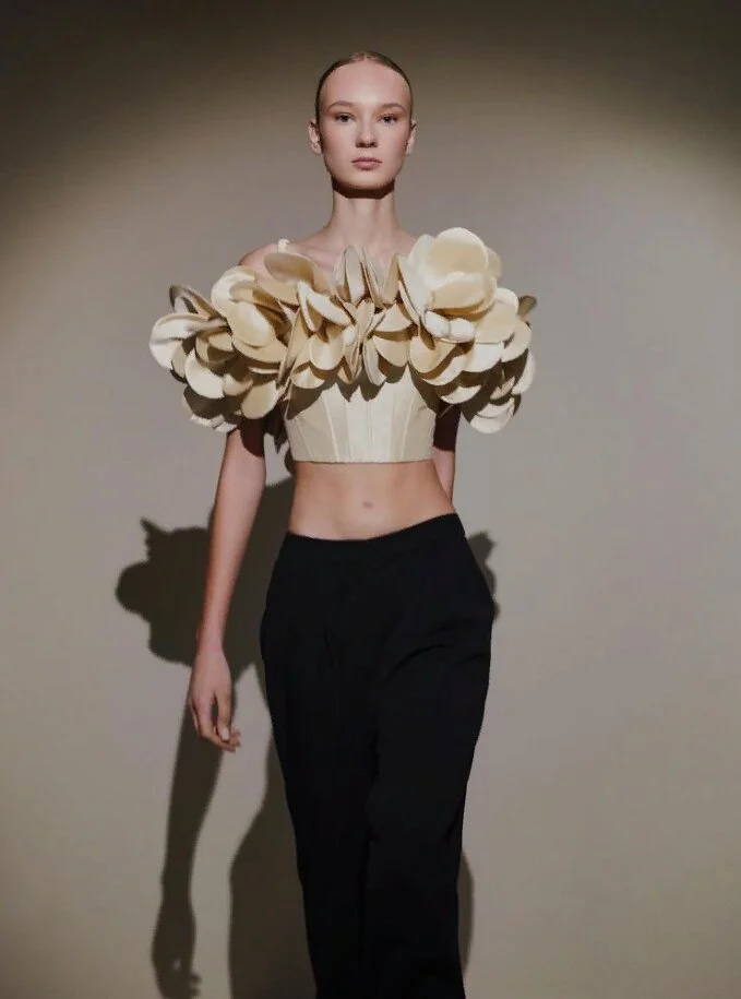Бежевый топ с объемными лепестками поражает воображение. По-настоящему “высокая мода”.