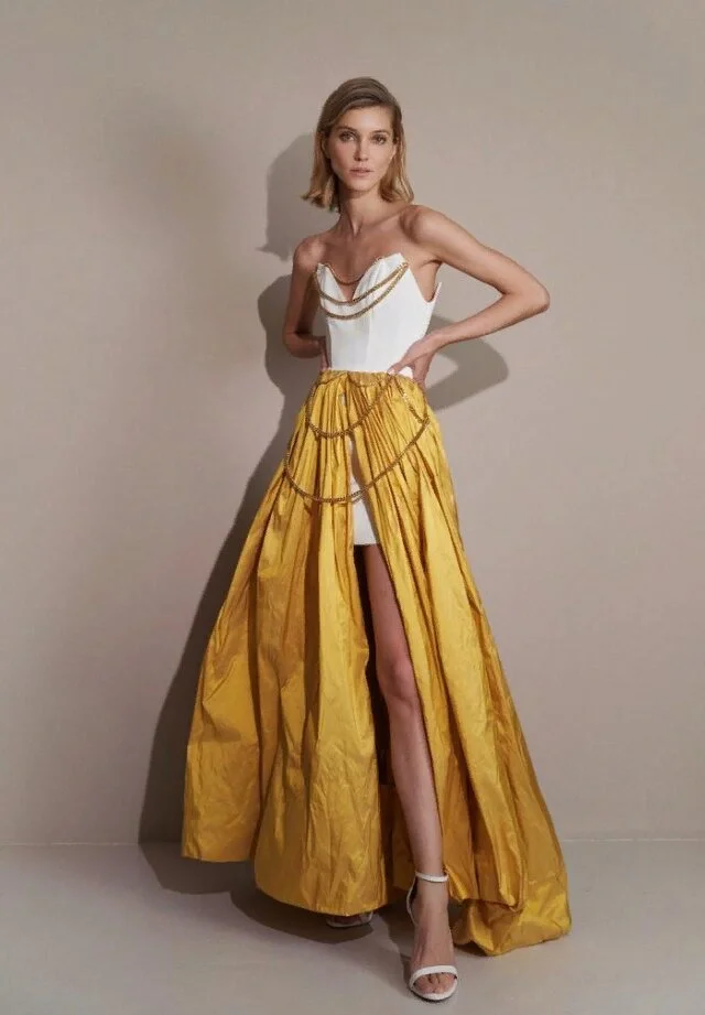 Золотисто белый наряд с юбкой из жатого материала. Торжественный образ с золотыми цепочками и глубоким разрезом.