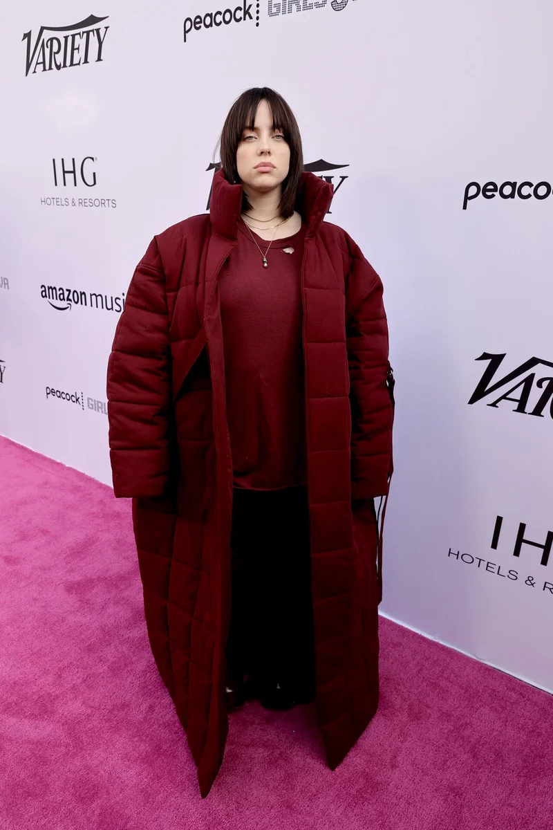 Как же она любит объемные вещи. На бранче хитмейкеров Variety's в 2021 году Билли появилась в огромном стеганом пуховике в пол винного оттенка и спортивном костюме такого же цвета. Такой наряд вполне в духе знаменитости.