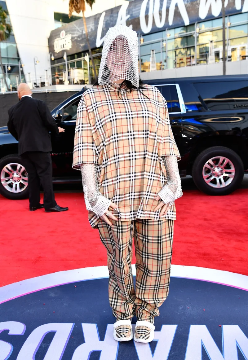 В 2019 году на American Music Awards певице было 17 лет. Большая популярность тогда еще была для нее непривычной и она отгородилась от всех хрустальной шляпой Versace. Костюм в фирменную клетку Burberry Билли дополнила блестящими рукавами и кроссовками.