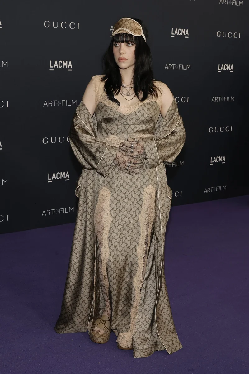 На гала-концерте LACMA Art 2022 звезда блистала в пижаме Gucci. Платье сорочка с вырезами и кружевами - непривычно откровенный наряд для Билли. Халат, тапочки, маска для сна, перчатки и даже колготки выполнены в узорах бренда. Интересно, креативно и смело.