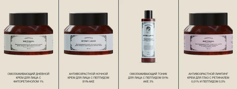 Этот бренд выпускает линейку только для борьбы с признаками старения. Производитель заявляет, что использует проверенные компоненты, поэтому эффект становится так быстро заметен. Обычно для достижения результата Verifique добавляет в состав ретинол, витамин С или пептиды.