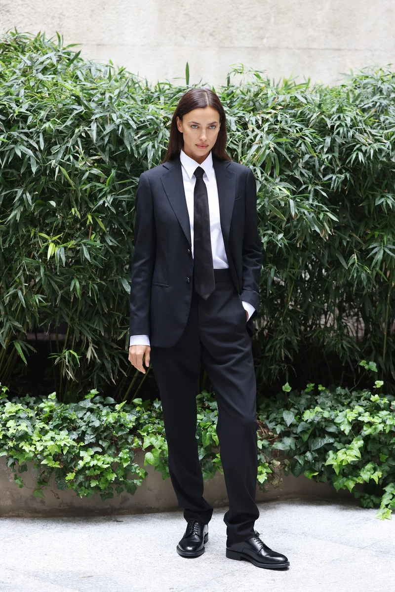 На фэшн-шоу Giorgio Armani модель появилась в классическом мужском костюме с галстуком. Получился образ уверенной в себе и загадочной девушки.