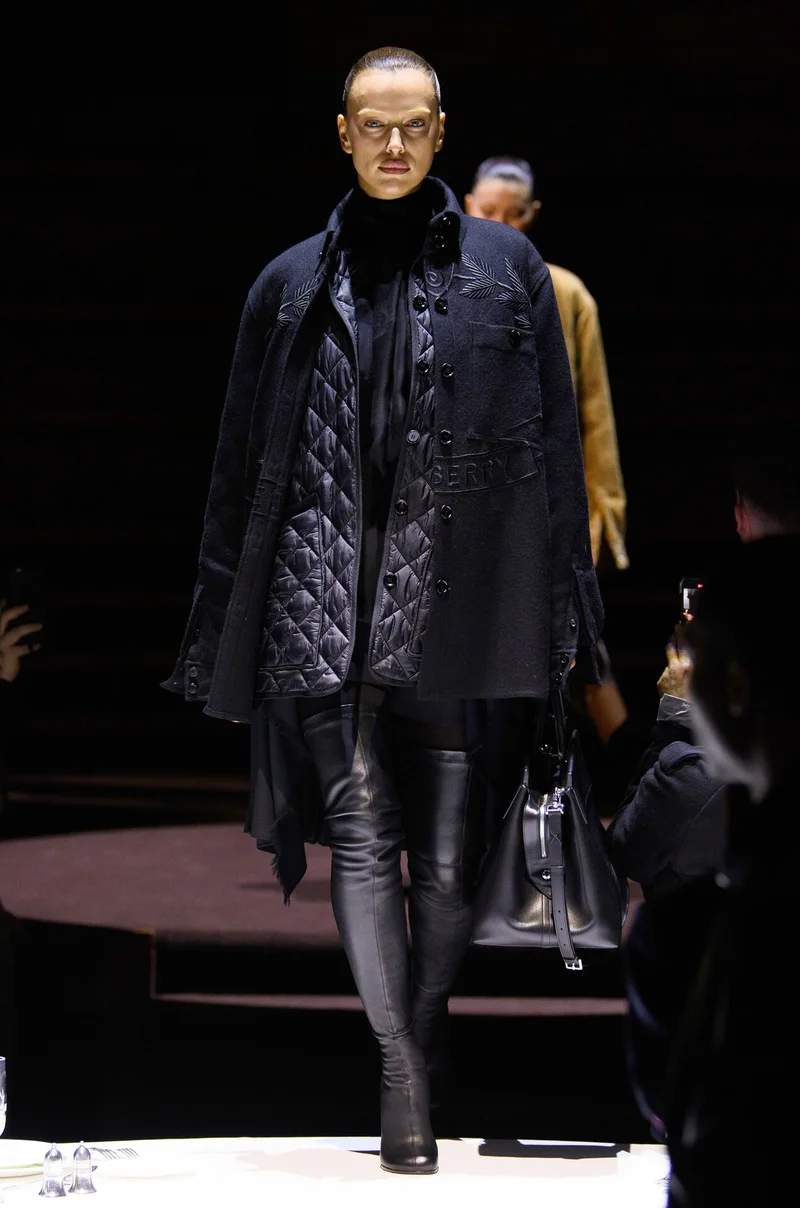 Еще один зимний образ, на этот раз на показе Burberry. Многослойный наряд из стеганой куртки и черного пальто на пуговицах отлично сочетается с кожаными сапогами и объемной сумкой.