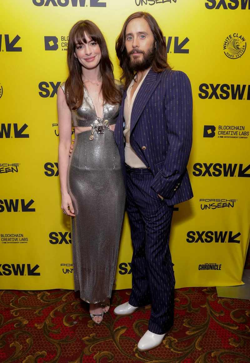 Энн Хэтэуэй появилась в этом платье на премьере шоу "WeCrashed", где она снялась с Джаредом Лето. Она подчеркнула образ серебристыми босоножками и мини-сумкой Pipatchara. Наряд прекрасно смотрится на Энни. Однако, Джаред, стоящий рядом, удачно дополняет картину.