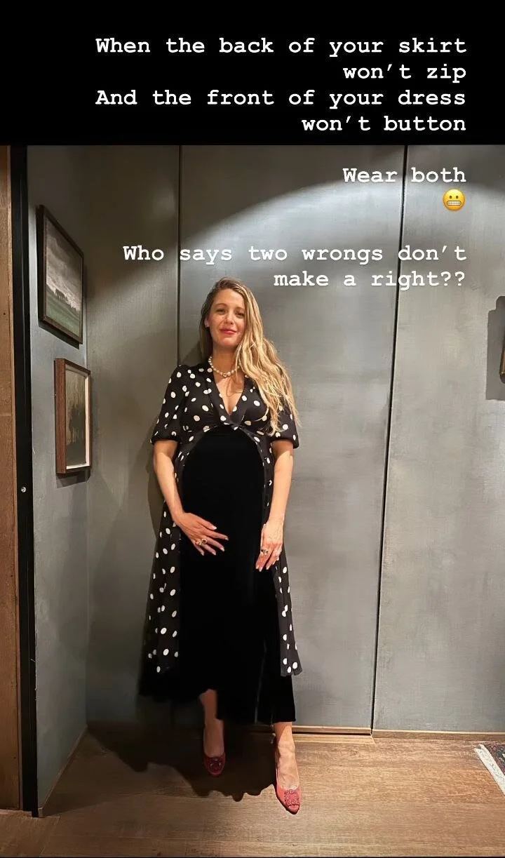 Актриса опубликовала фотографию в красивом образе и рассказала, что делать, если любимые вещи уже не застегиваются на талии. Лайвли надела одновременно черную юбку и платье в белый горох. Наряд получился красивым и элегантным.