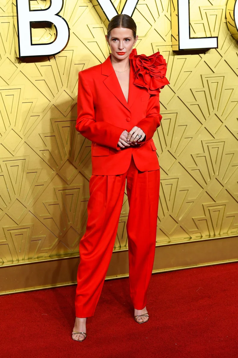 Ярко-красный костюм телезвезды выглядит очень стильно. Брюки-бананы интересно сочетаются с пиджаком с объемным украшением на плече. Красная помада гармонично завершает образ.