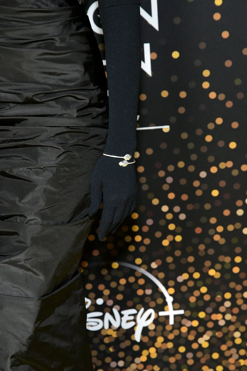 Дополнили эффект недосягаемости певицы черные перчатки выше локтя. Поверх них девушка надела браслет в виде двух змей, украшенных камнями. Комплект браслету составили серьги, также в виде змей с висящими элементами из зеленых и прозрачных камней.