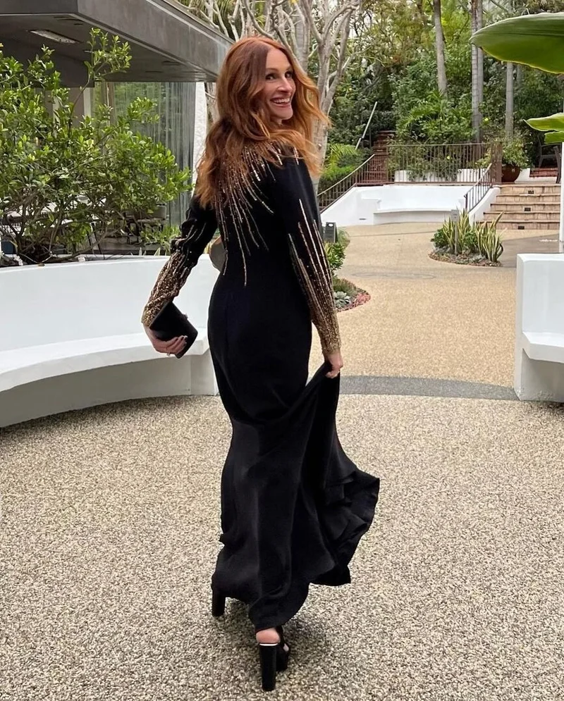 Джулия Робертс вышла на красную дорожку премии Critics Choice Awards в чёрном облегающем платье, ставшем одним из самых запоминающихся нарядов вечера. Это платье — дело рук дизайнеров и мастеров бренда Schiaparelli. На его официальной страничке в социальной сети появились фотографии актрисы, сделанные во время мероприятия и подготовки к нему, а также кадры создания «солнечной» вышивки.