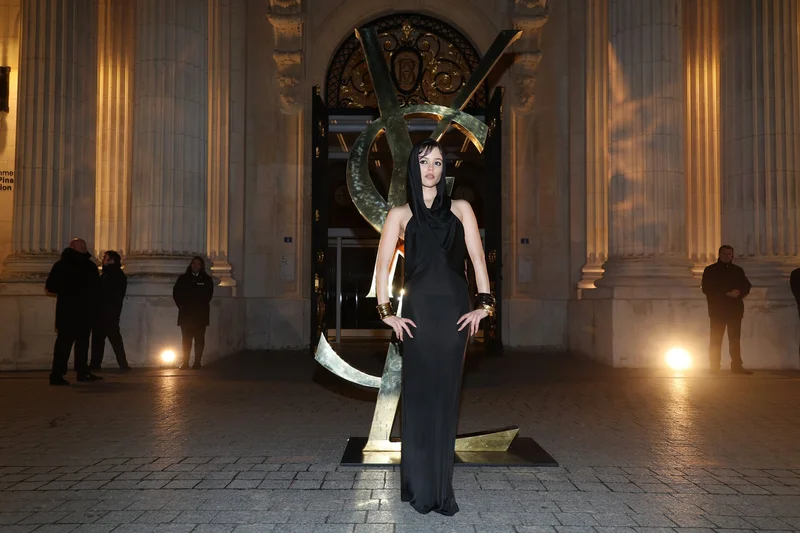 Звезда сериала “Уэнсдей” стала посетила презентацию в рамках мужской Недели моды. Перед мероприятием она продемонстрировала свой образ на фоне огромного логотипа “YSL”.
