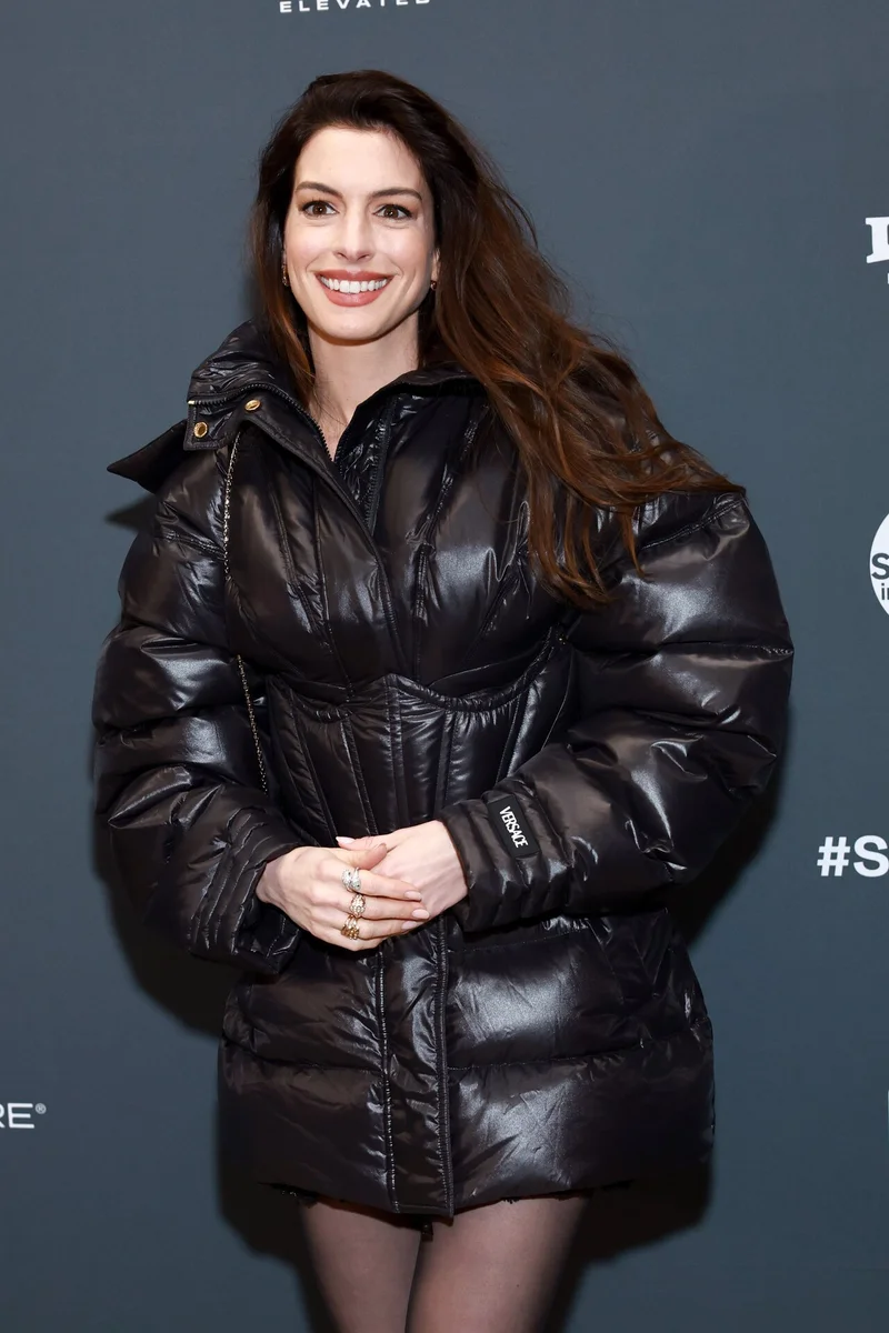 На красной дорожке звезда кинохитов «Как стать принцессой», «Дьявол носит Prada» и «Отпетые мошенницы» появилась в коротком стёганом пуховике чёрного цвета. Сняв приталенную верхнюю одежду с объёмными рукавами, Энн предстала перед фотографами в чёрном платье мини на бретельках. На ткани наряда заметен узор из крупных клеток. Завершили образ массивные ботильоны и сумочка на цепочке.