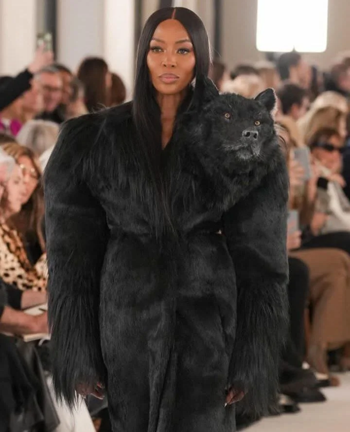 Платье с леопардом на Шалом Харлоу впечатляет не меньше - меховой наряд со звериным оскалом на лифе также стал предметом бурных обсуждений. Наоми Кэмпбелл досталась роль волчицы - она вышла в черном меховом пальто с акцентированными плечами. Ее образ выглядит невероятно гармонично, может волк - тотемное животное легендарной модели?