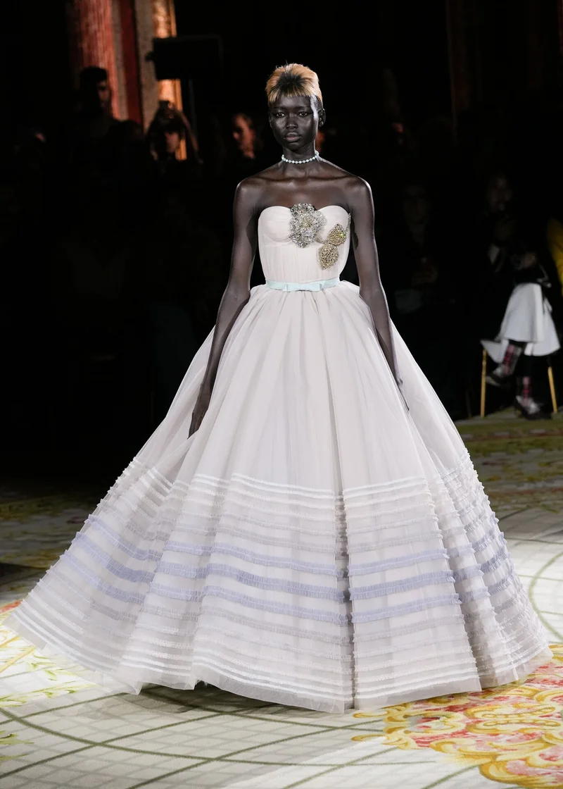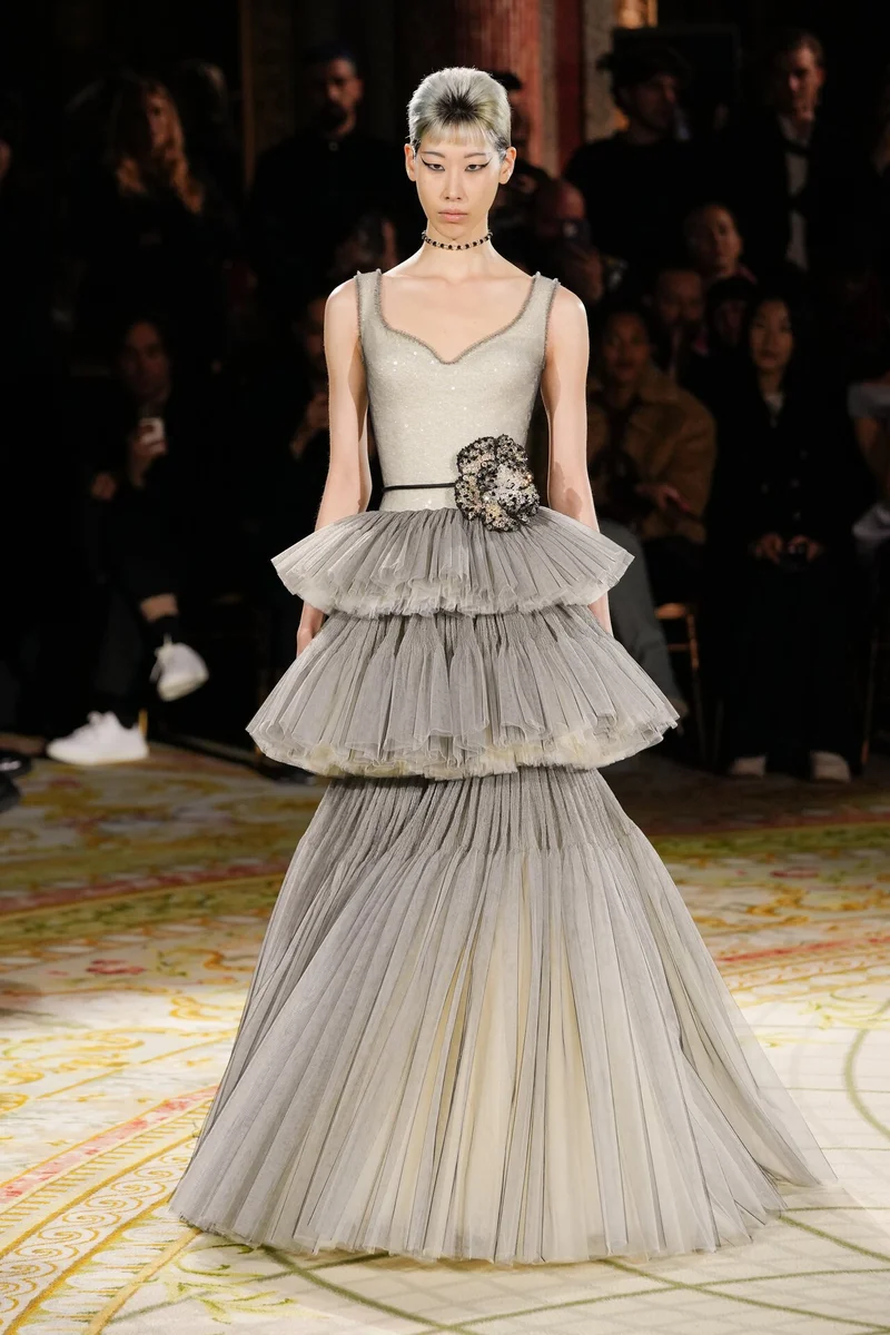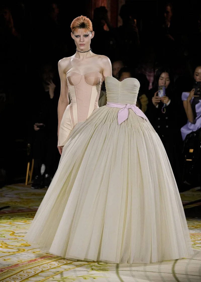Самым интересным выходом стало платье, которое модель надела верх ногами. Девушка прошлась ни разу не споткнувшись, несмотря на плотную юбку на голове.