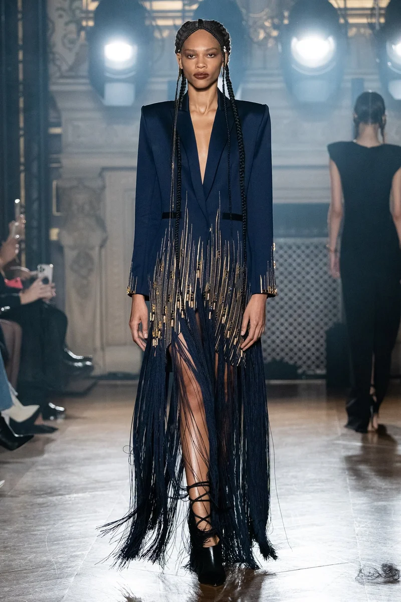 Синее платье-пиджак с длинной бахромой и вышивкой - интересный образ и довольно универсальный.