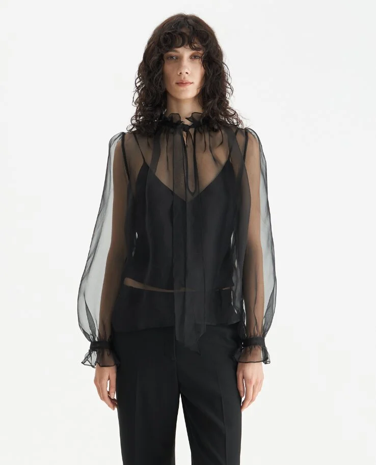 Полупрозрачная шелковая блуза выглядит очень нежно и трогательно. Изящная модель для стильных девушек.