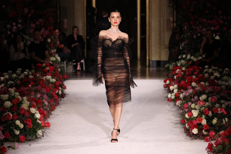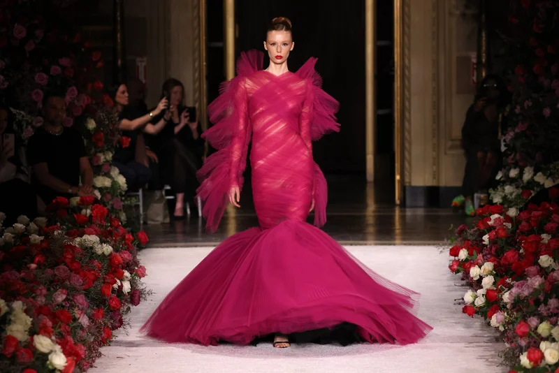 Зал, украшенный множеством роз, усиливал эффект от просмотра восхитительных нарядов. Много тюли, струящегося шелка и большое количество объемных элементов - дизайнер демонстрирует всю мощь своей фантазии.