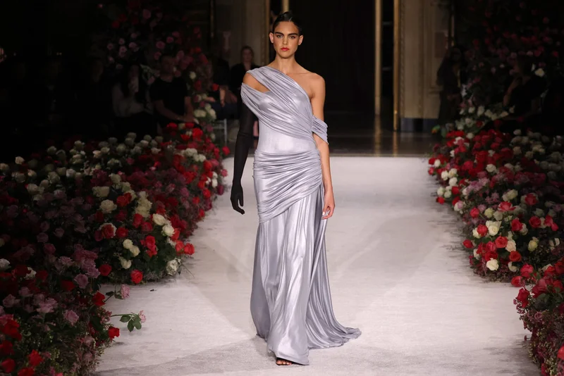 Серебристое струящееся платье с драпированными элементами уже хочется увидеть на ком-то из знаменитостей. Невероятно изящная модель и тонкая работа.