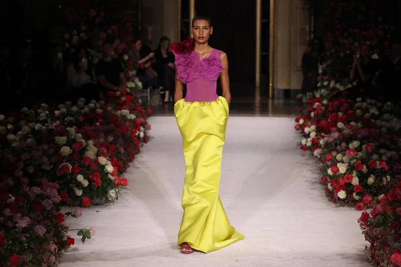 Дизайнер, похоже, экспериментировал с формой и цветом. Наряд с желтой юбкой макси и цветочным лифом - очень интересный выбор.