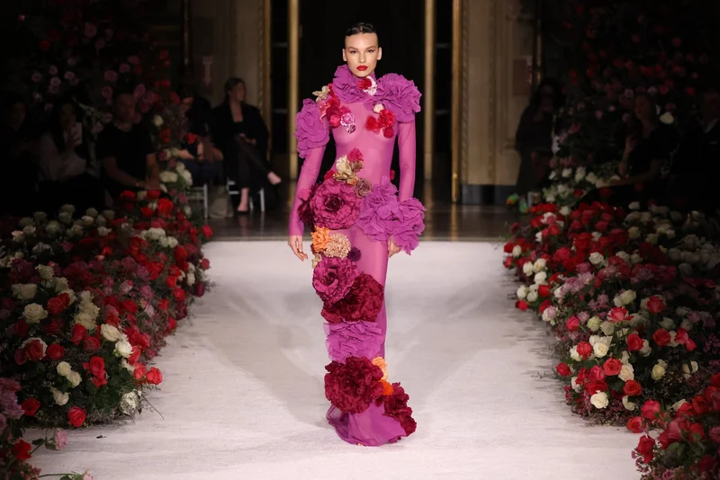 Лавандово-розовый полупрозрачный наряд, украшенный множеством объемных цветов выглядит очень эффектно. Образ полностью соответствует настроению показа и гармонирует с оформлением зала.